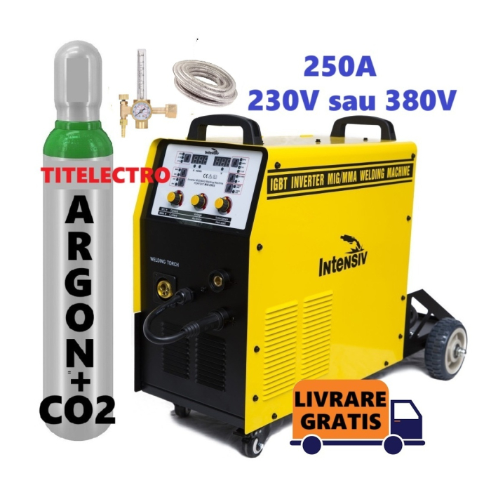 Aparatul de sudura MIG-MAG/MMA - Intensiv PERFEKT MIG 250 SYNERGIC (230/380V) PROFESIONAL este un aparat tip invertor, echipat cu tranzistoare IGBT puternice, pentru performate si suduri excelente; este recomandat atat pentru sudura in mediu de gaz protector, cu sarma plina, a oricarui tip de material, cat si pentru sudura fara gaz, cu sarma FLUX ( NO GAS )